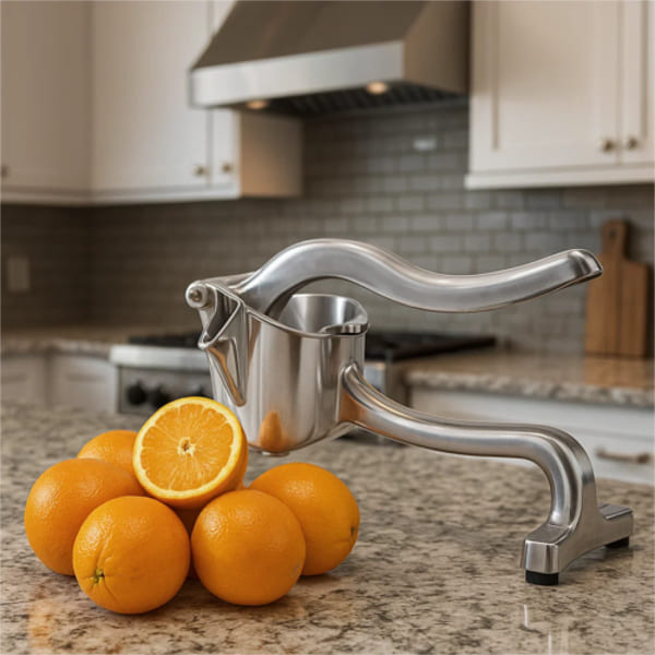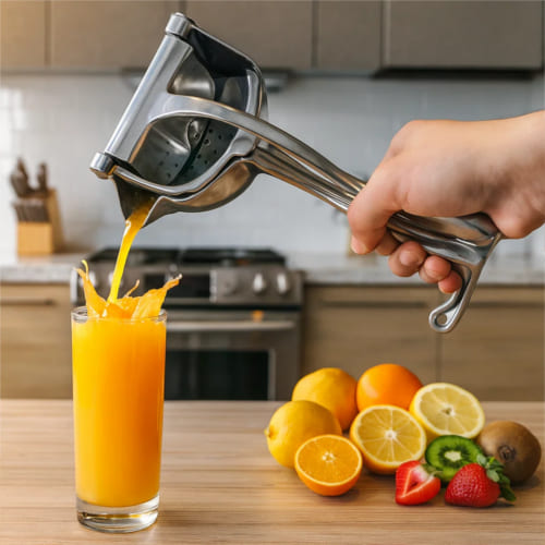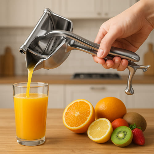 Механизм работы прост и эффективен: фрукты разрезаются пополам, укладываются на конус и прижимаются пресс-головкой. Сок проходит через встроенный фильтр, очищаясь от мякоти и косточек — вы получаете чистый и натуральный напиток!